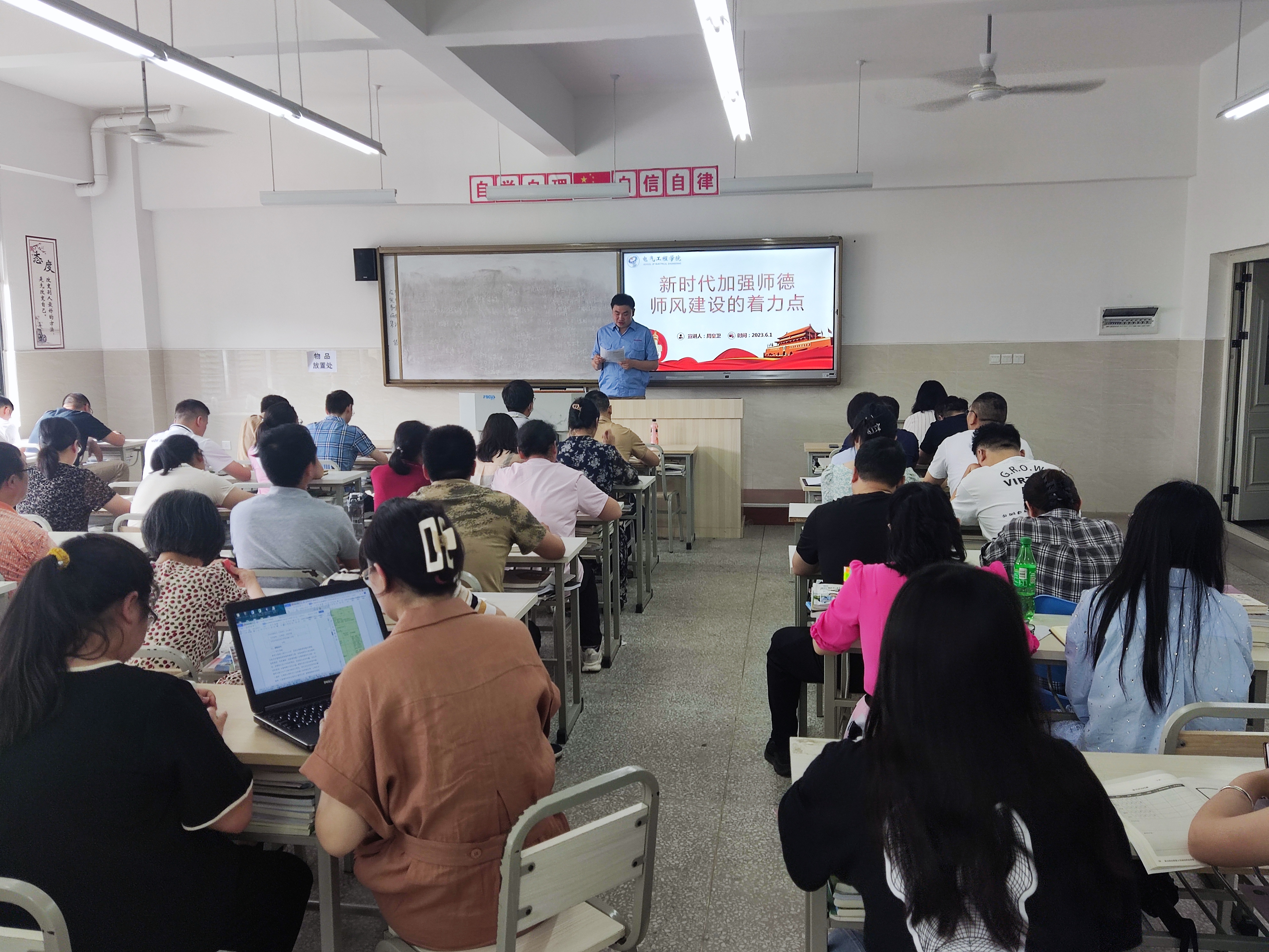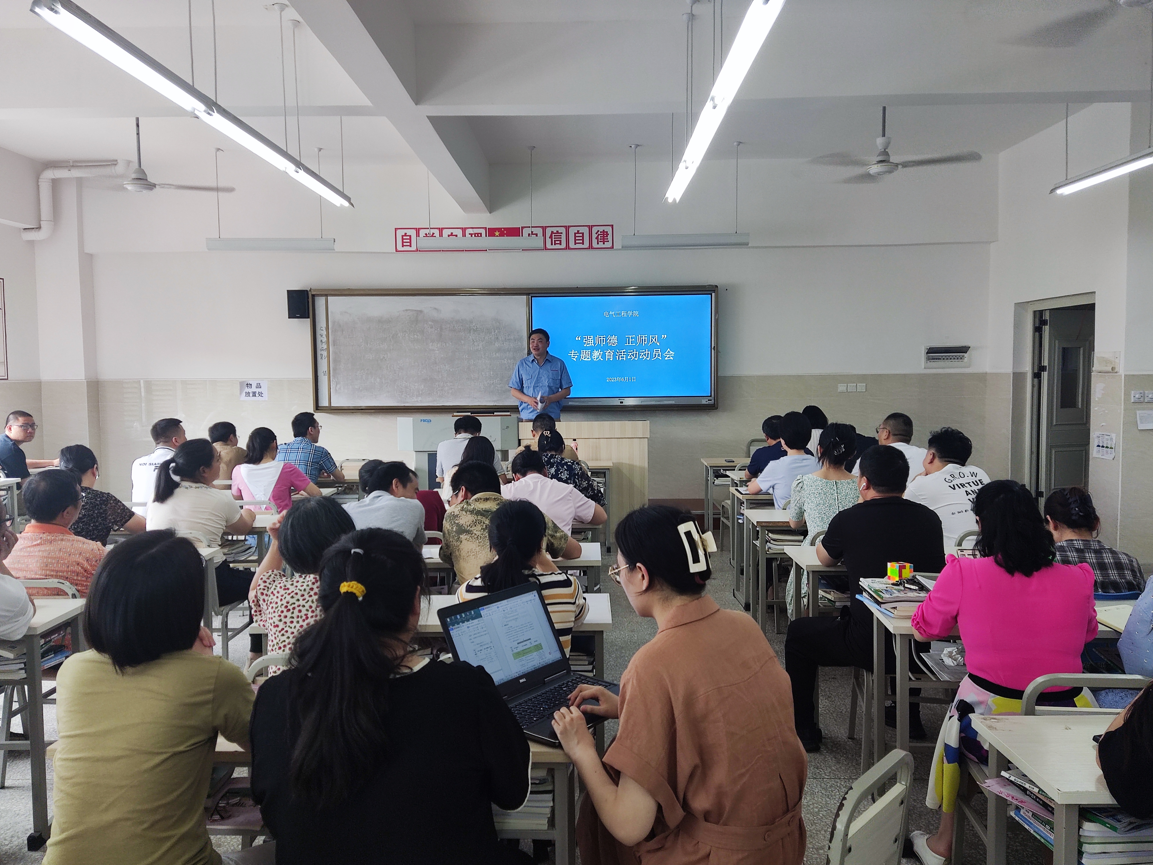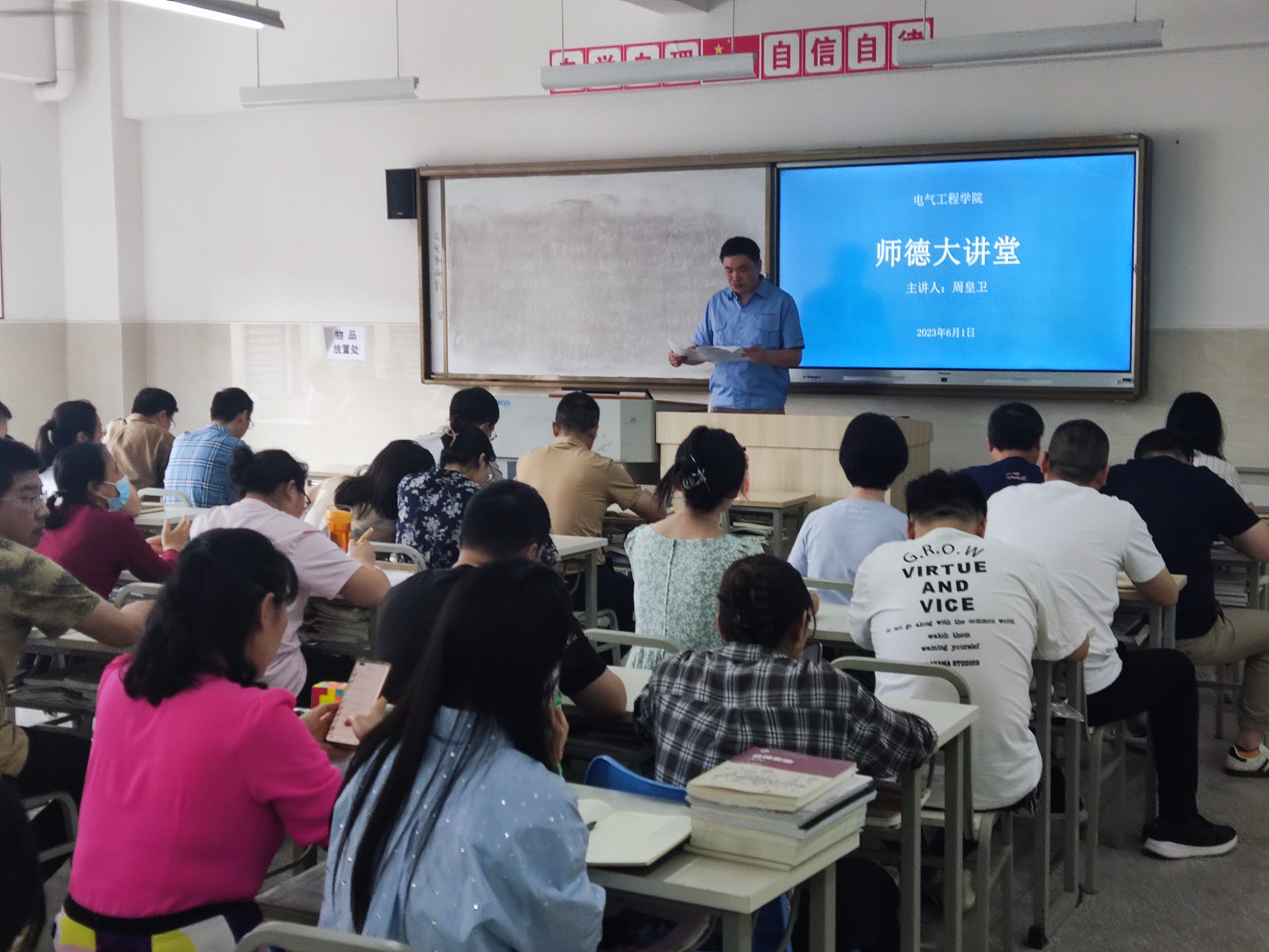 周皇卫向公司全体教职工传达了公司“强师德 正师风”专题教育活动工作方案并作动员,号召全院要深化思想认识,严格落实公司师德师风建设要求,坚定为党育人、为国育才的初心使命,坚持以德立身、以德立学、以德施教,争做“四有”好老师。并作题为《领学新时代加强师德师风建设的着力点》的师德讲堂宣讲,从新时代高校教师师德师风建设要突出政治标准的首要地位、明确职业道德的高线要求,丰富爱生情怀的深刻内涵、拓展学习践行的实践路径、牢记并遵守新时代高校教师职业行为十项准则等五个方面进行了阐述。