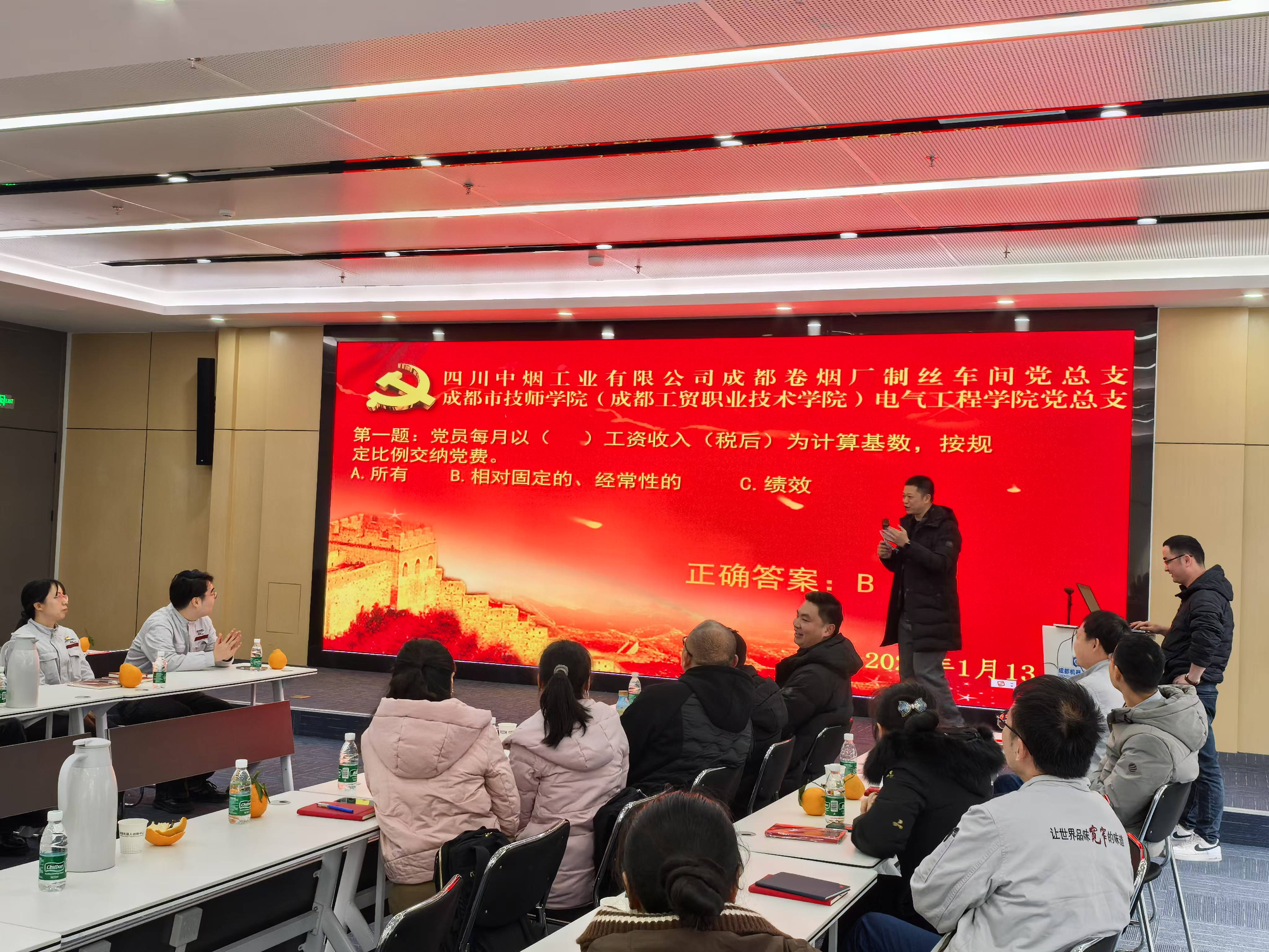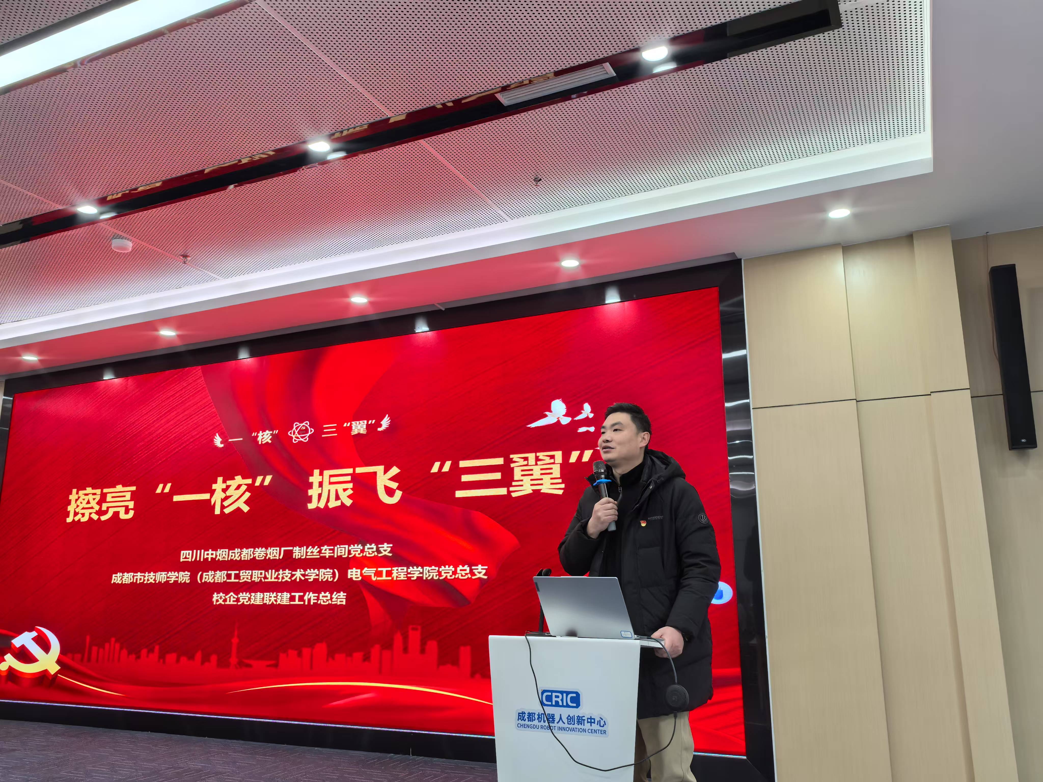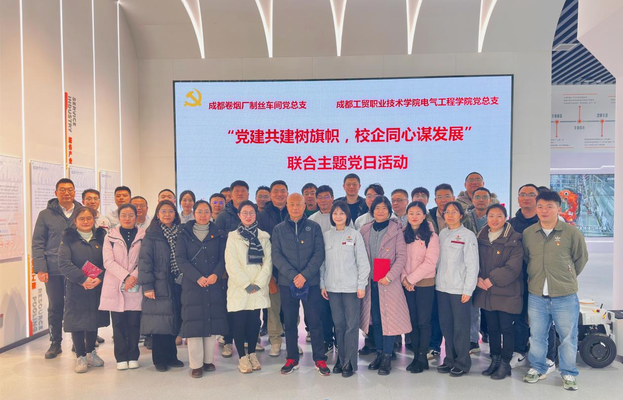 为持续深入学习习近平新时代中国特色社会主义思想,贯彻落实党的二十大精神,巩固主题学习教育成果,进一步深化校企合作,促进“一核三翼”校企联合党建工作体系更加完善,电气工程公司党总支与成都卷烟厂制丝车间党总支与于2025年1月13日在成都市龙潭工业园成都机器人创新中心开展“党建共建树旗帜,校企同心谋发展”联合主题党日活动。